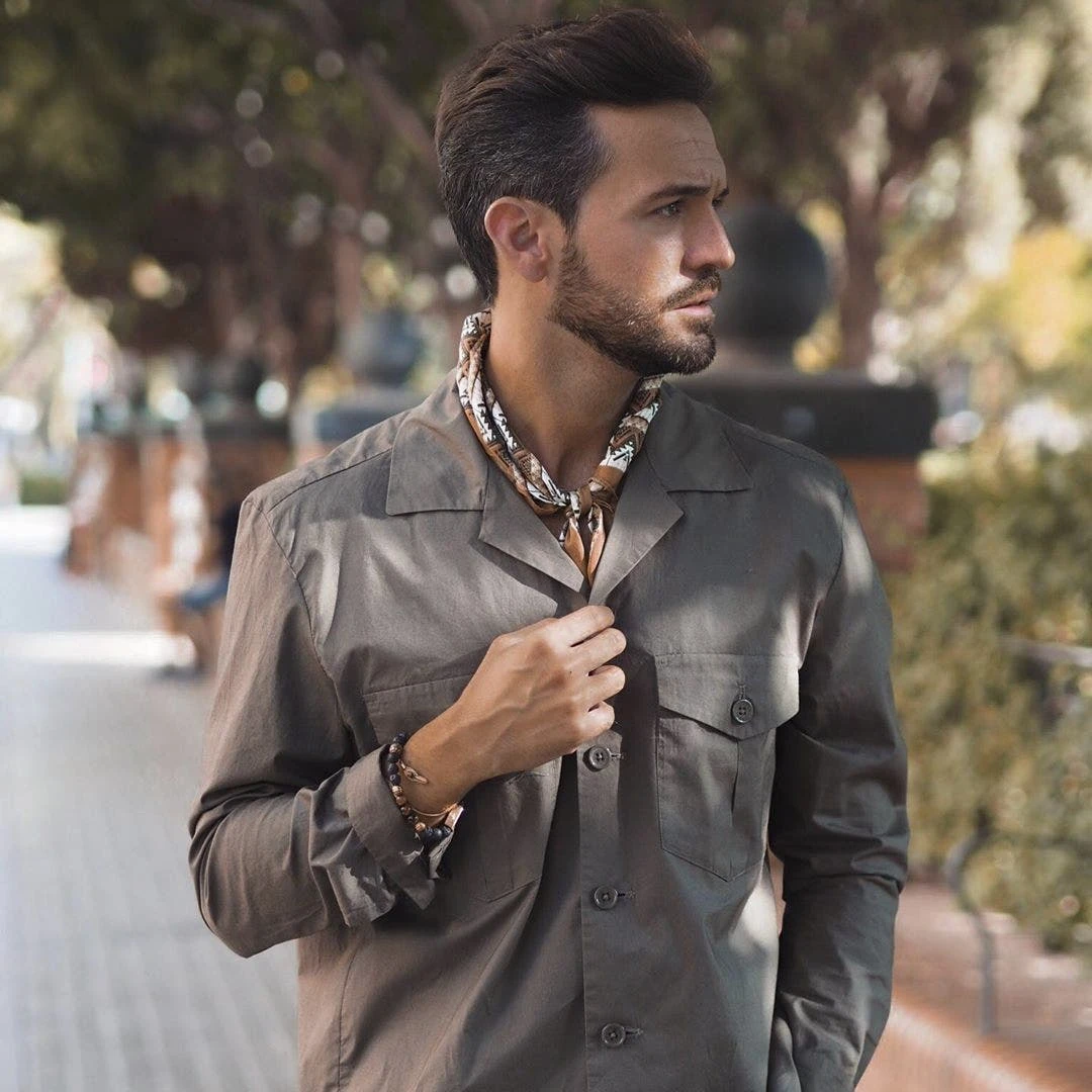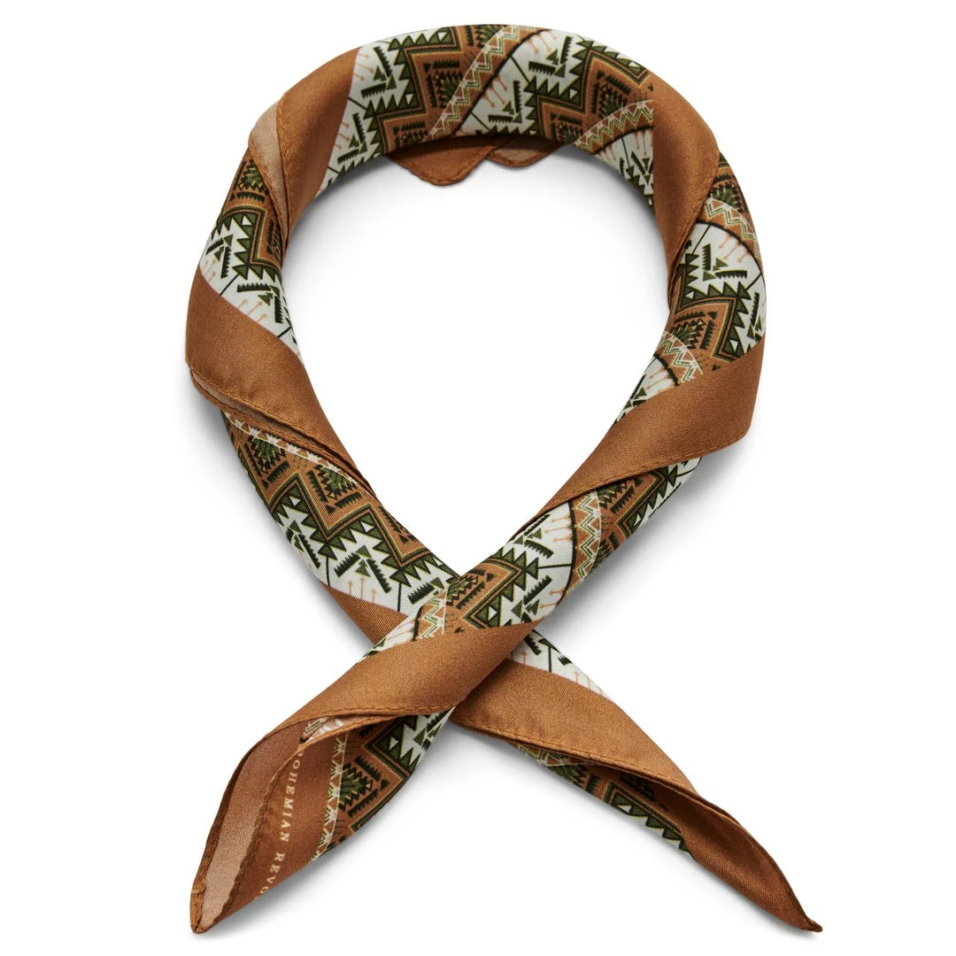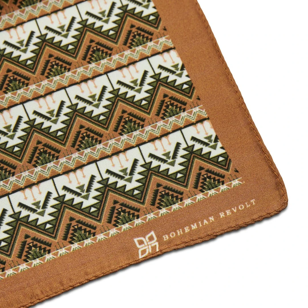 Faites tourner les têtes avec ce magnifique foulard kaki et crème. Son design danois authentique vous donnera un style ludique d’inspiration Woodstock. Fabriqué à partir de la soie naturelle la plus fine.