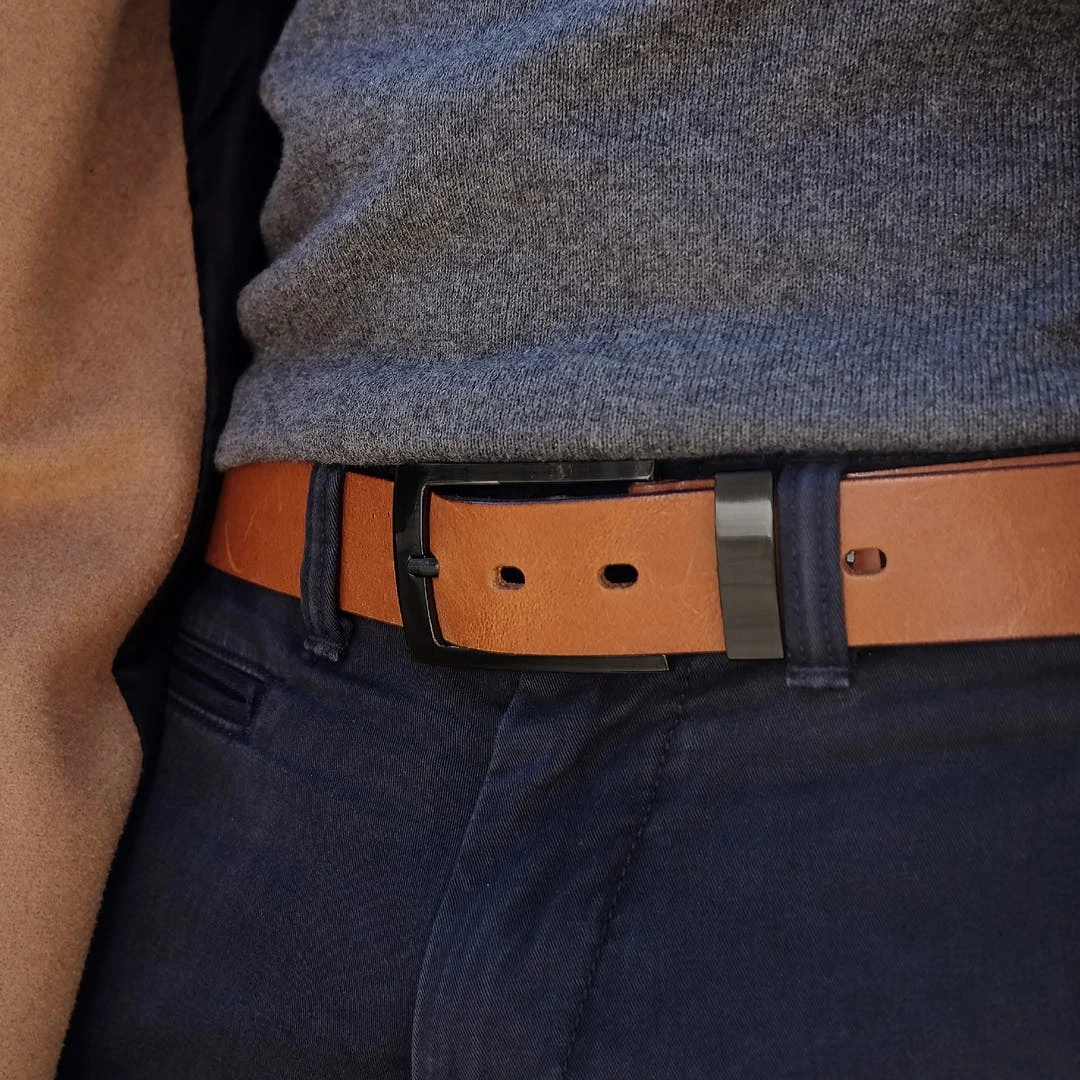 Pour les ceintures élastiques pour homme, nous vous communiquons une longueur approximative parce que celles-ci sont, par définition, légèrement extensibles. Vous pouvez également modifier la longueur de votre ceinture en la découpant comme indiqué sur l’image. Tout ce dont vous avez besoin est d’un couteau suffisamment aiguisé pour couper le cuir et d’une pince perforatrice.