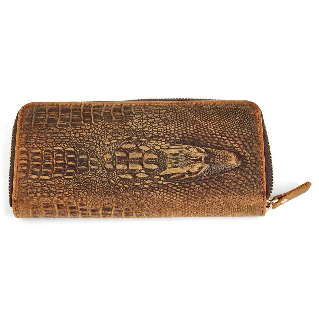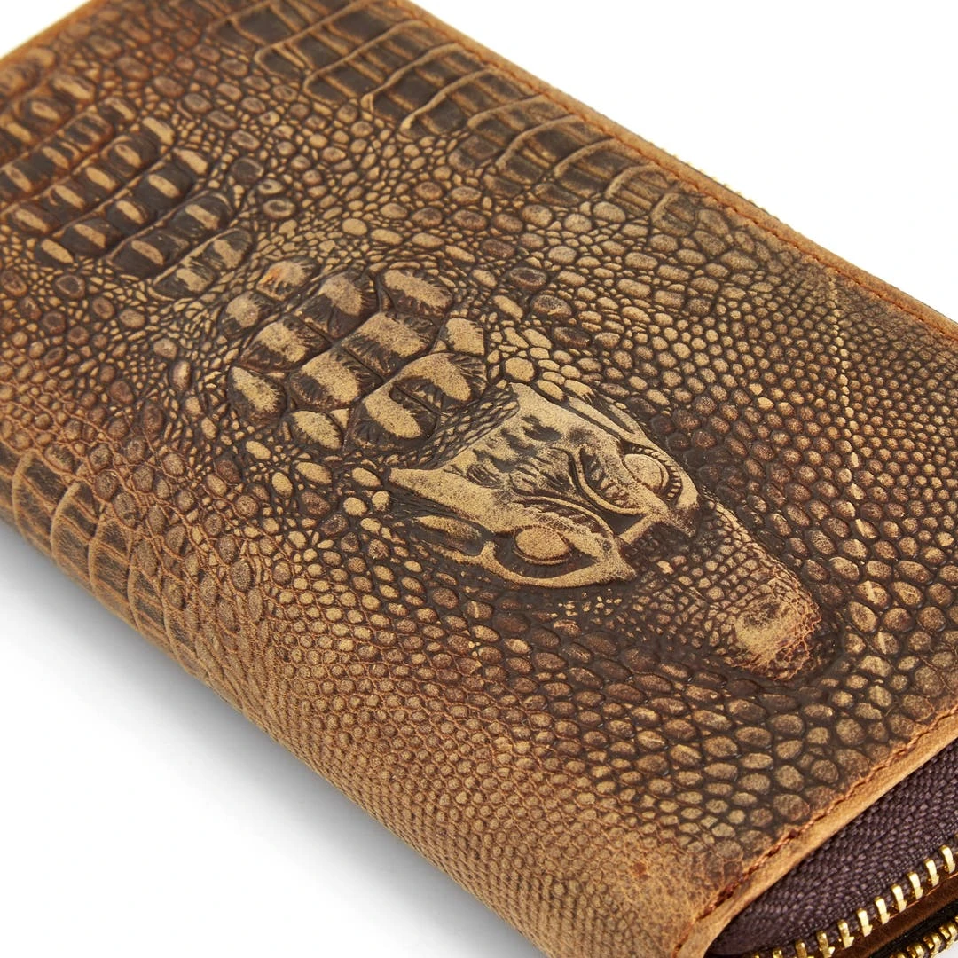 Y-a-t’il une solution à ce dilemme ? Nous pensons l’avoir. Cet élégant portefeuille en véritable cuir de vachette a été façonné de manière à lui procurer un look croco véritable. Il se ferme au moyen d’une fermeture éclair et affiche même une tête d’alligator sur sa face externe !