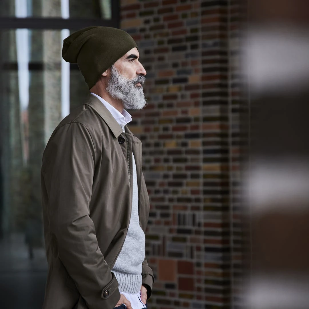 Élégante alternative au noir ou au marron, ce modèle de couleur olive de tonalité neutre sera très facile à assortir. Portez-le comme un ample beanie ou repliez son bord pour un port plus serré.