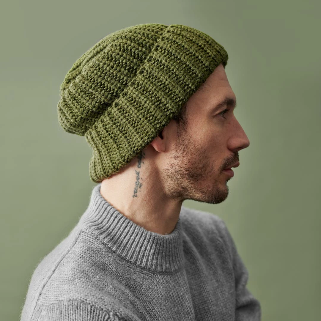 Ce bonnet vert olive est fabriqué avec un mélange de matériaux, ce qui lui confère un style plus épais qui retient la chaleur sans emprisonner la sueur.