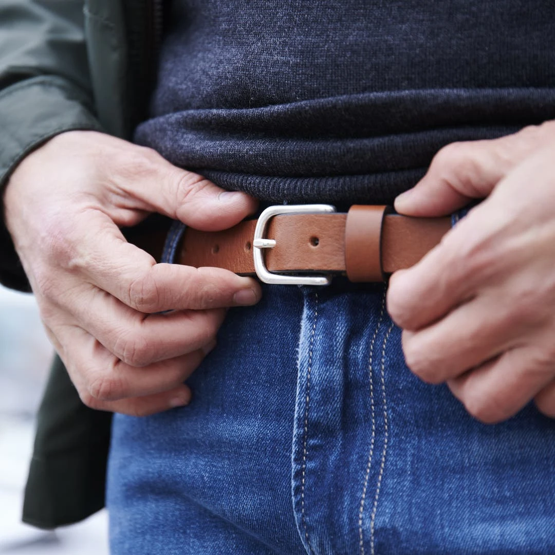 Pour les ceintures élastiques pour homme, nous vous communiquons une longueur approximative parce que celles-ci sont, par définition, légèrement extensibles. Vous pouvez également modifier la longueur de votre ceinture en la découpant comme indiqué sur l’image. Tout ce dont vous avez besoin est d’un couteau suffisamment aiguisé pour couper le cuir et d’une pince perforatrice.