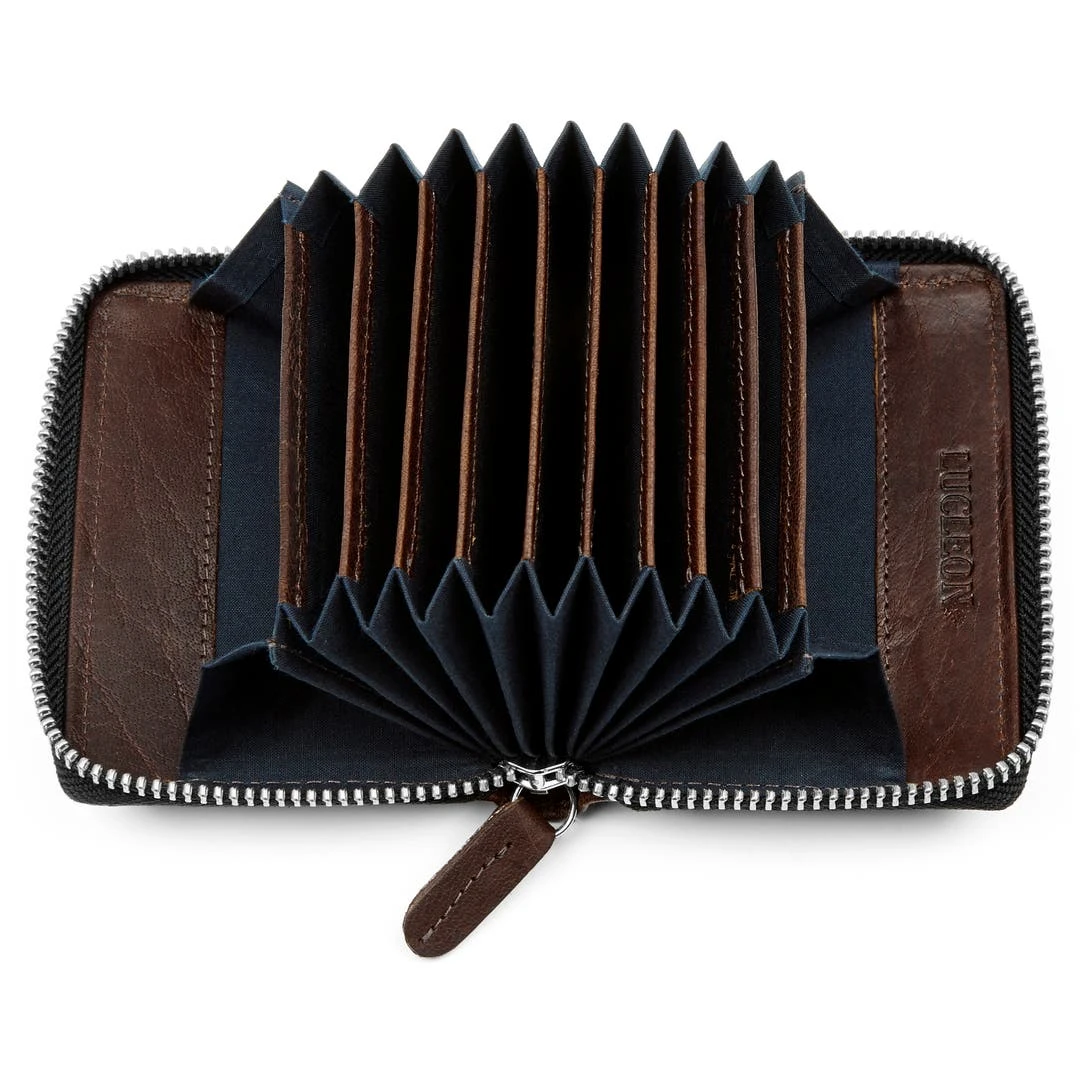Confectionné en cuir de buffle de haute qualité, ce porte-cartes brun foncé à la texture unique gagnera en beauté au fil du temps qui passe. Il pourra accueillir jusqu’à 10 cartes de crédit, réparties dans 10 pochettes séparées.