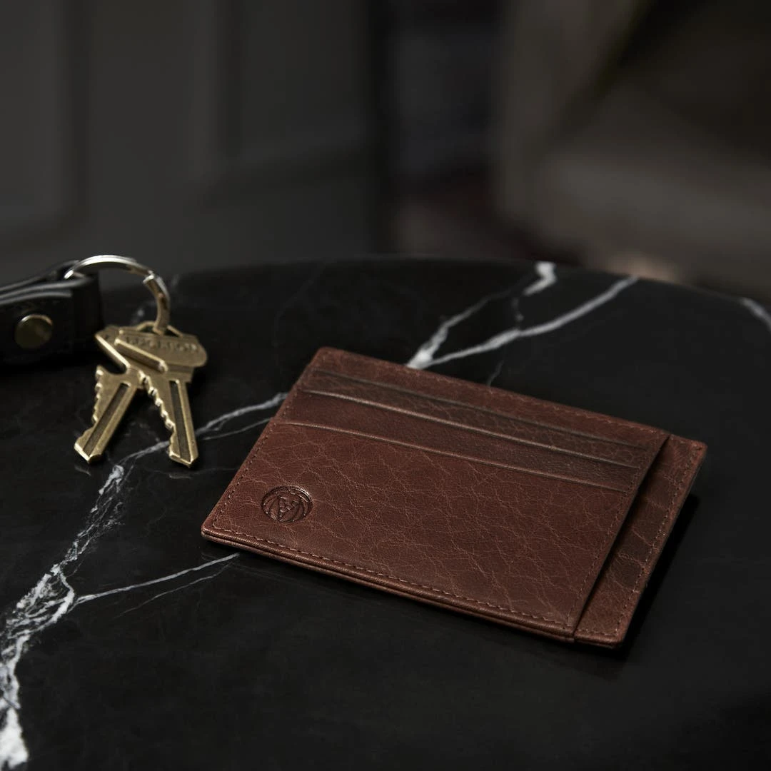 Un élégant porte-cartes marron foncé fabriqué en cuir de buffle de qualité supérieure. Le cuir a été peu traité afin de conserver les qualités naturelles de la peau, sa couleur unique, son odeur et ses plis. Durable et résistant, il intègre une protection RFID qui empêche le vol numérique de vos données personnelles.