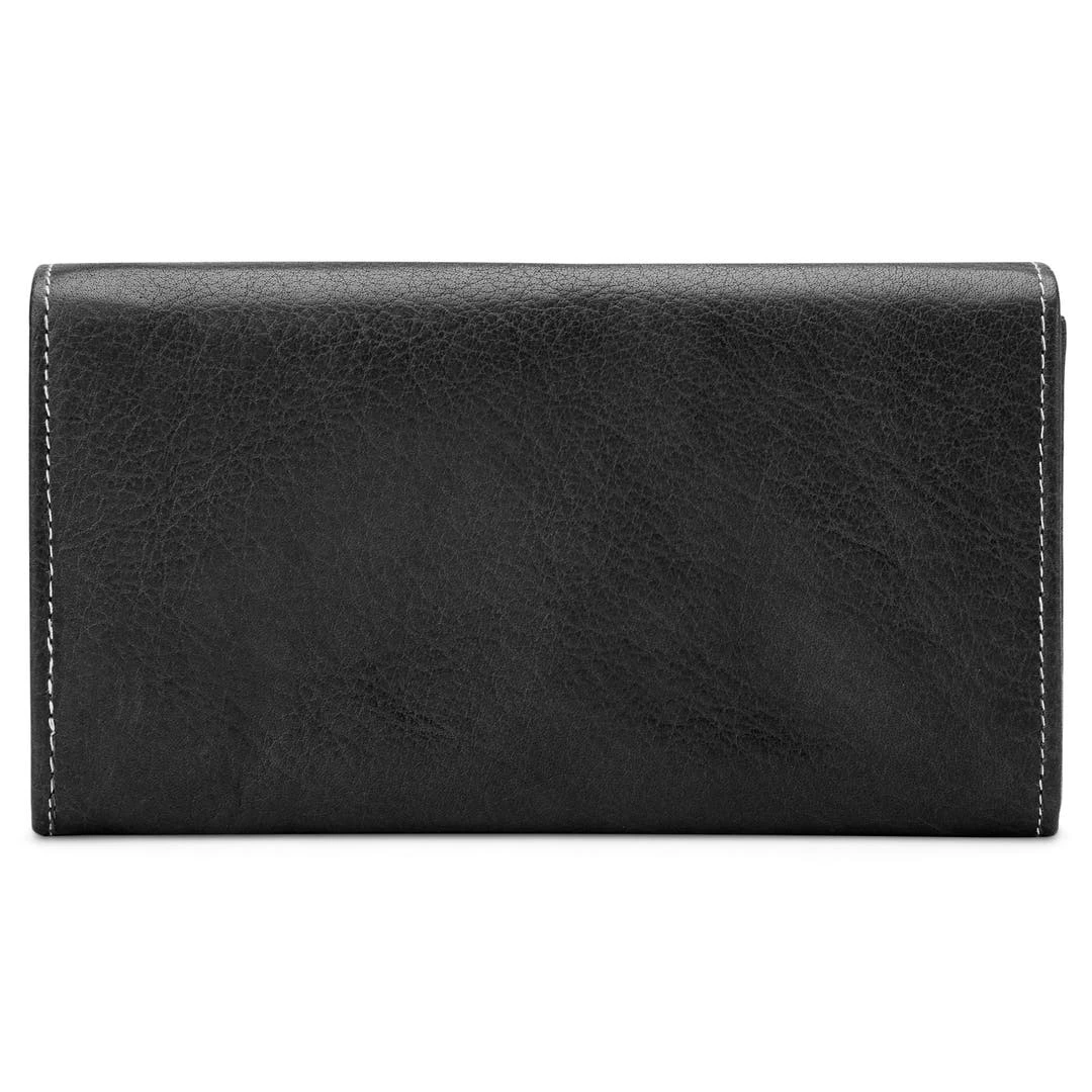 Ce grand portefeuille en cuir noir s’ouvre pour révéler plus d’espace que vous ne pouvez l’imaginer.