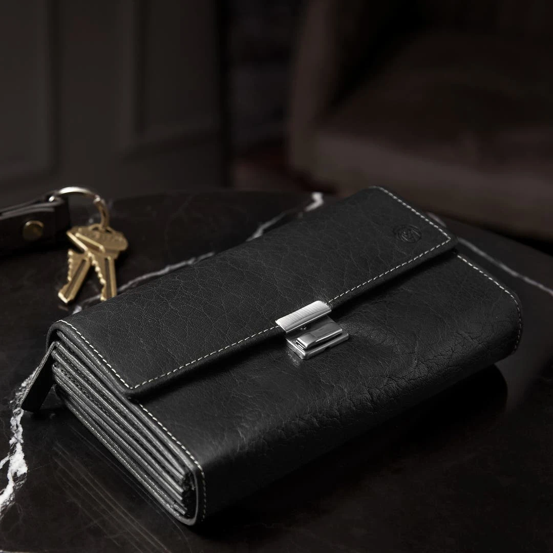 Ce portefeuille se referme solidement avec un fermoir argenté poli. Conçu au Danemark par la marque Lucleon. Coffret Signature inclus.