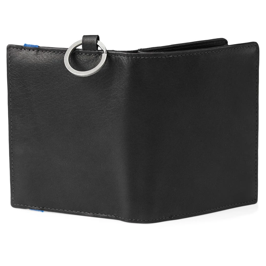 Utilisez l’élastique bleu pour maintenir le portefeuille fermé lorsque vous utilisez vos clés et pour maintenir le rabat intérieur bien rangé lorsque vous accédez à la pochette pour pièces de monnaie.