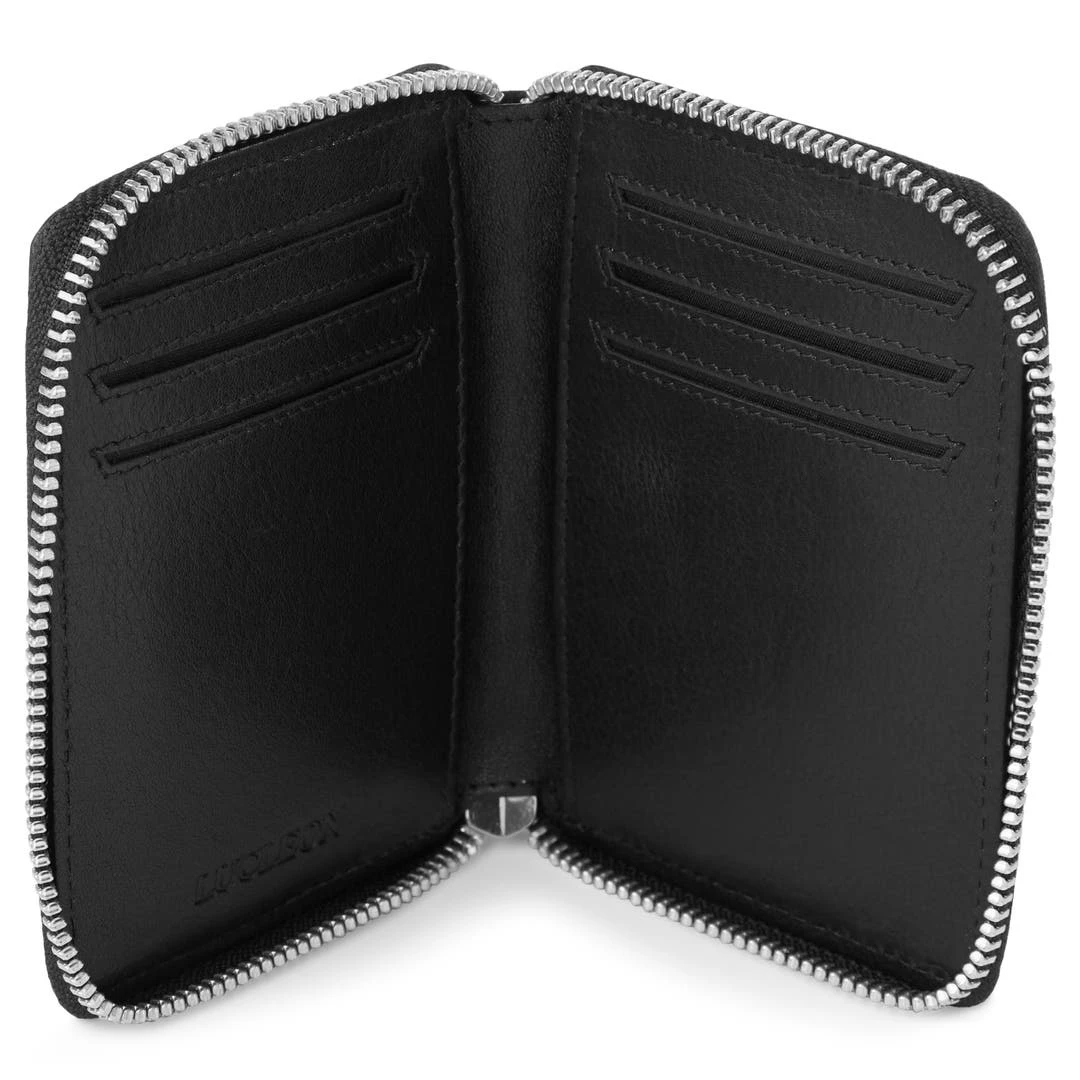 Dézippez ce portefeuille en cuir noir pour révéler six emplacements pour cartes et 2 pochettes de rangement. Ce portefeuille/porte-cartes épuré est doté d’une chaîne argentée pour le garder attaché en toute sécurité à votre pantalon et une protection RFID pour protéger vos données personnelles.