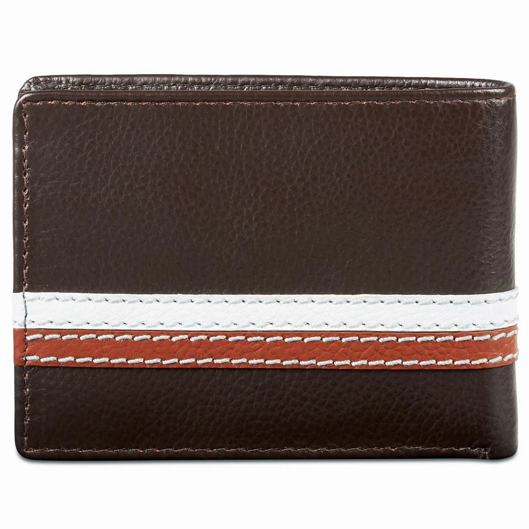 Ce portefeuille en cuir marron est décoré de rayures colorées (blanche et havane) qui lui procurent un look très original.