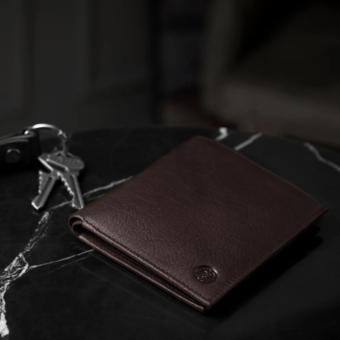 Un portefeuille en cuir de buffle marron haut de gamme, durable et résistant aux changements de températures. Ce portefeuille de qualité ne perdra pas sa forme, peu importe les saisons.