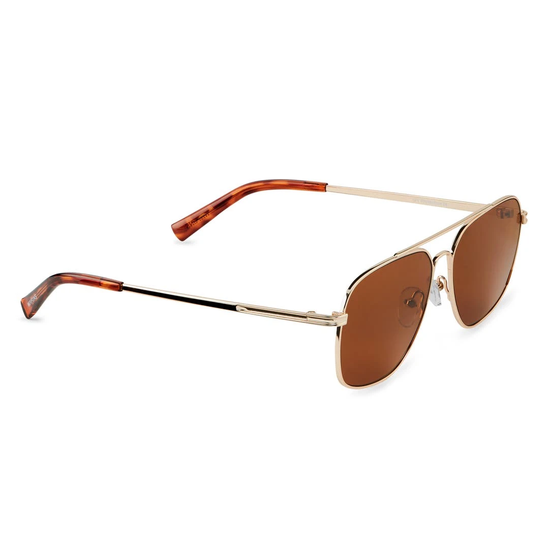 Une paire de lunettes de soleil aviateur de couleur or pour hommes équipées d’une monture en acier inoxydable, d’un double pont et de plaquettes de nez réglables pour un confort optimal.