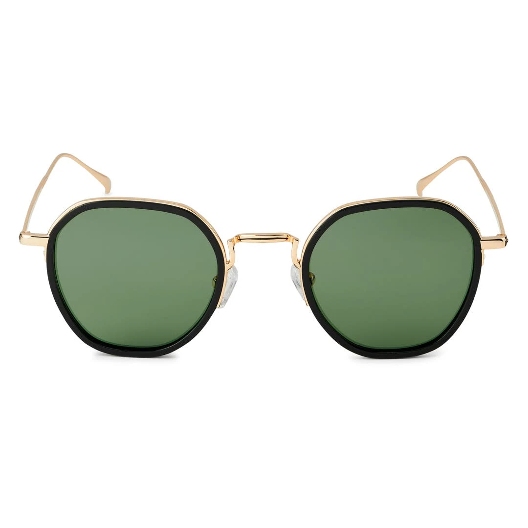 Une paire de lunettes de soleil pour hommes fabriquée en acier inoxydable de couleur or et équipée de verres TAC multicouches pour une protection accrue contre les UV et les reflets les plus éblouissants.
